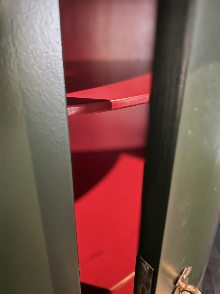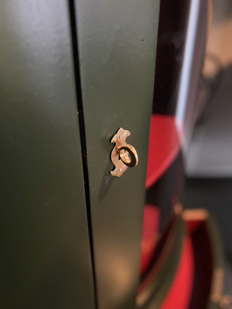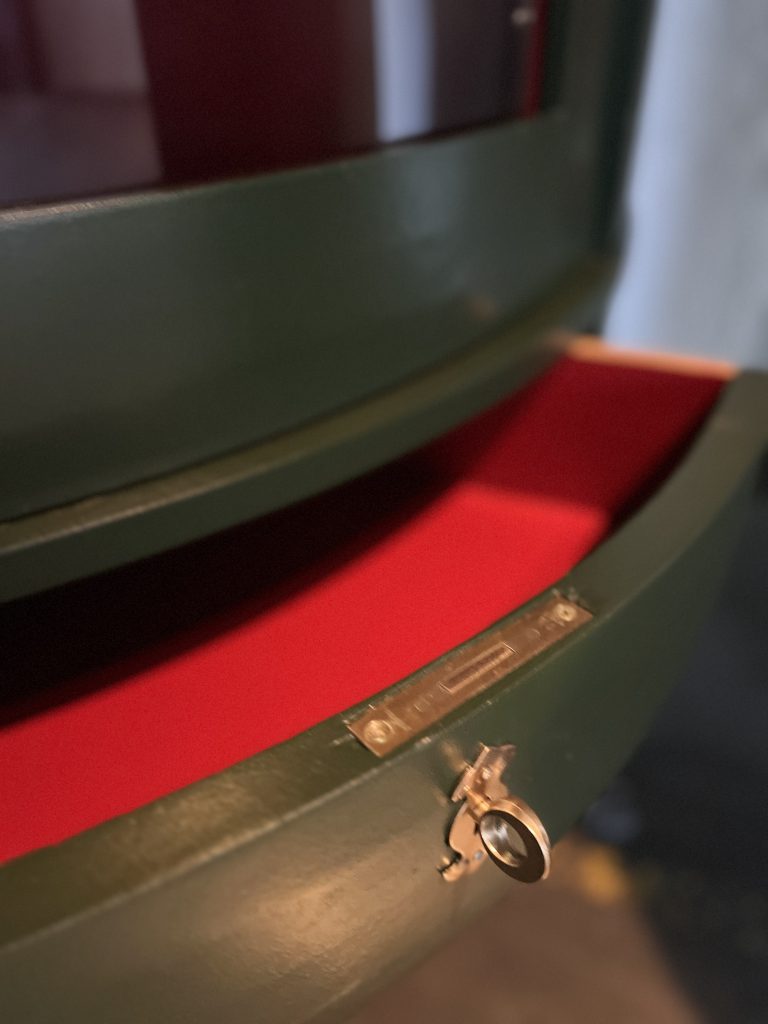 Die Vitrine bietet Stauraum hinter Glas und eignet sich ideal zur Präsentation von Deko, Gläsern oder Sammlerstücken. Ein charmantes Detail: In der Schublade und an der Glastür sind noch die originalen Schlösser vorhanden. Trotz langer Suche war jedoch kein passender Schlüssel mehr zu finden und auch Ersatzschlösser waren nicht kompatibel. Daher sind die Schlösser außer Betrieb. Optisch habe ich einen passenden Schlüssel-Look angebracht, damit der Charakter des Möbels erhalten bleibt.
