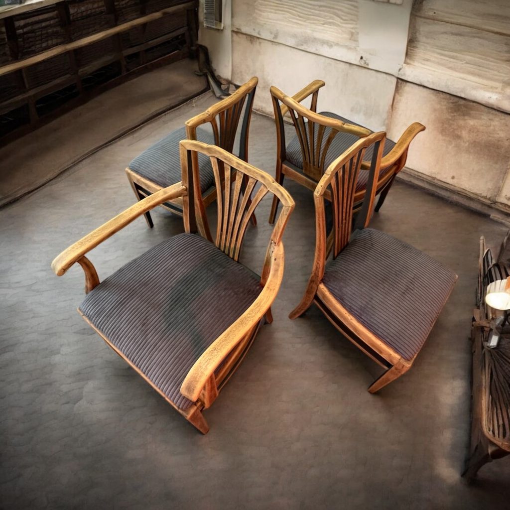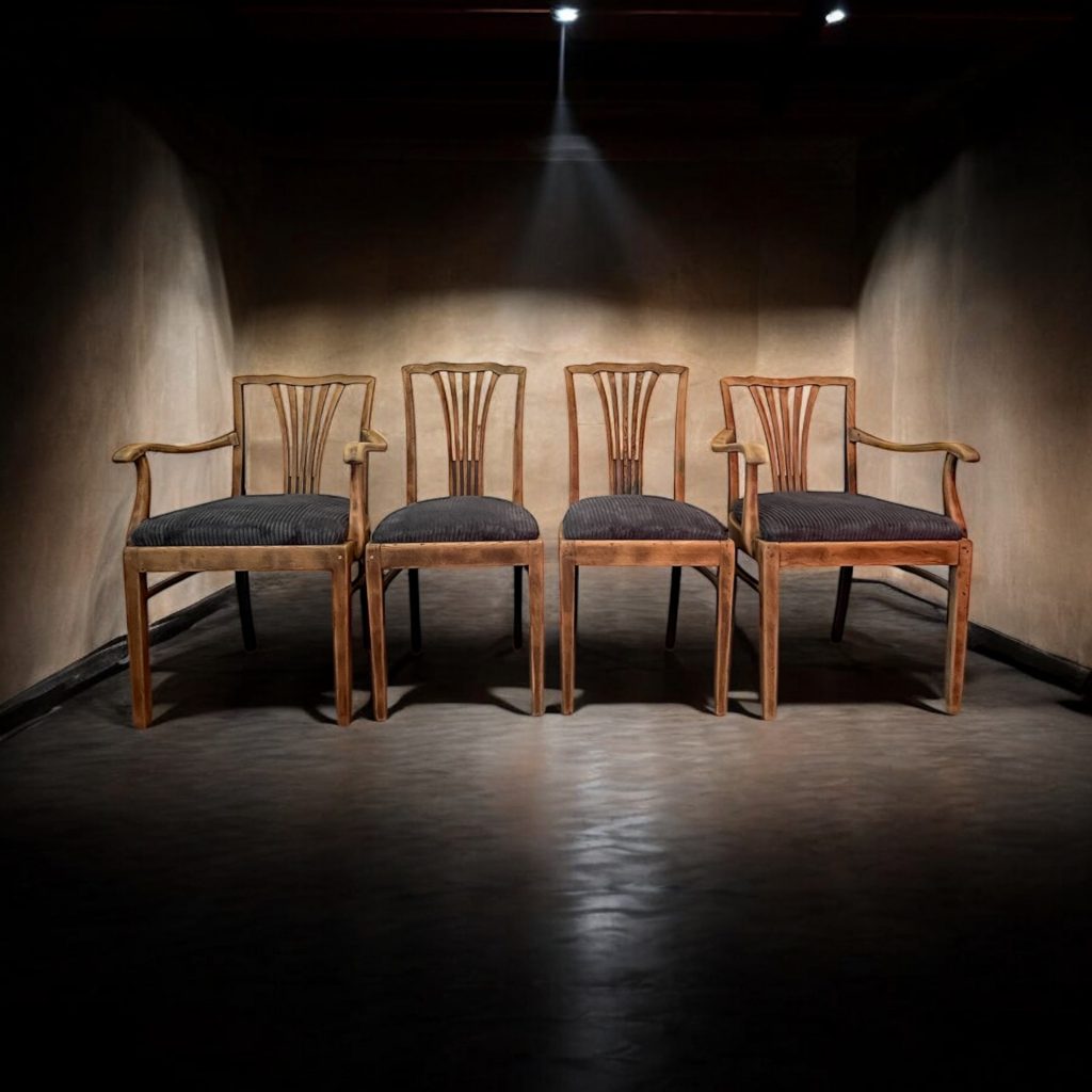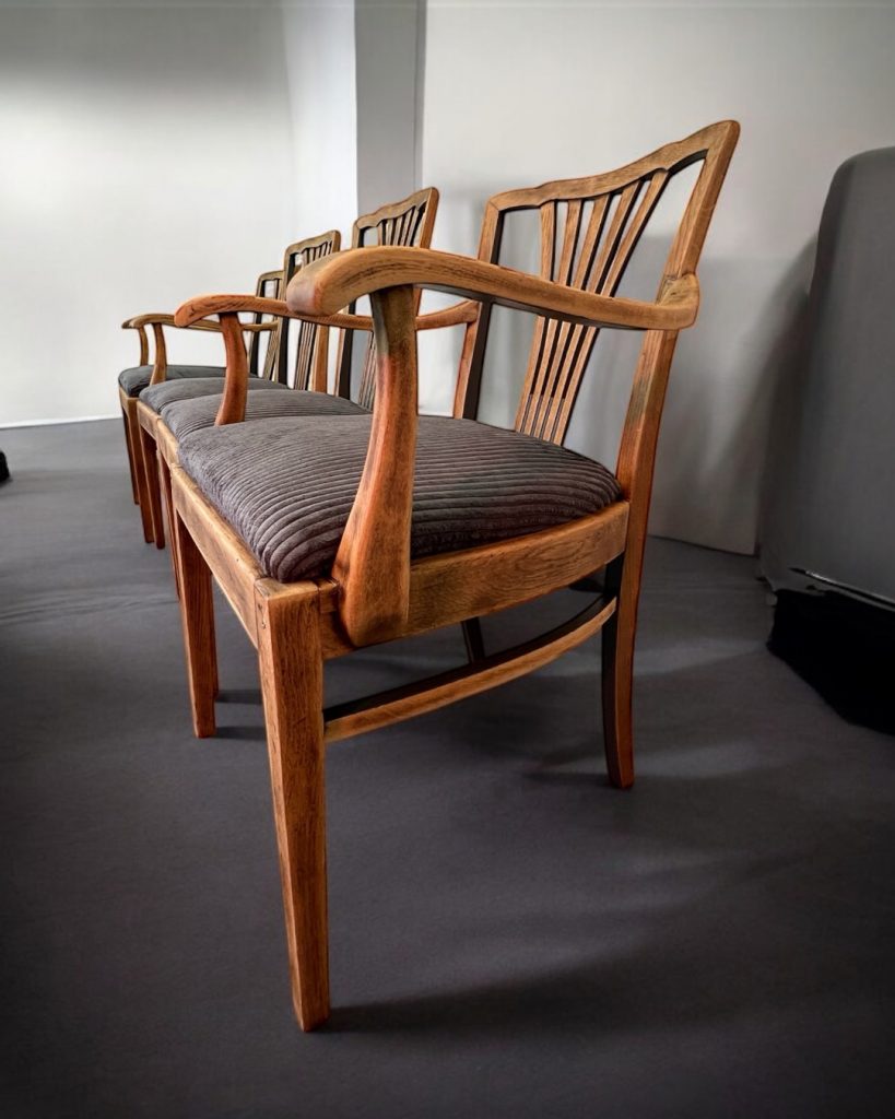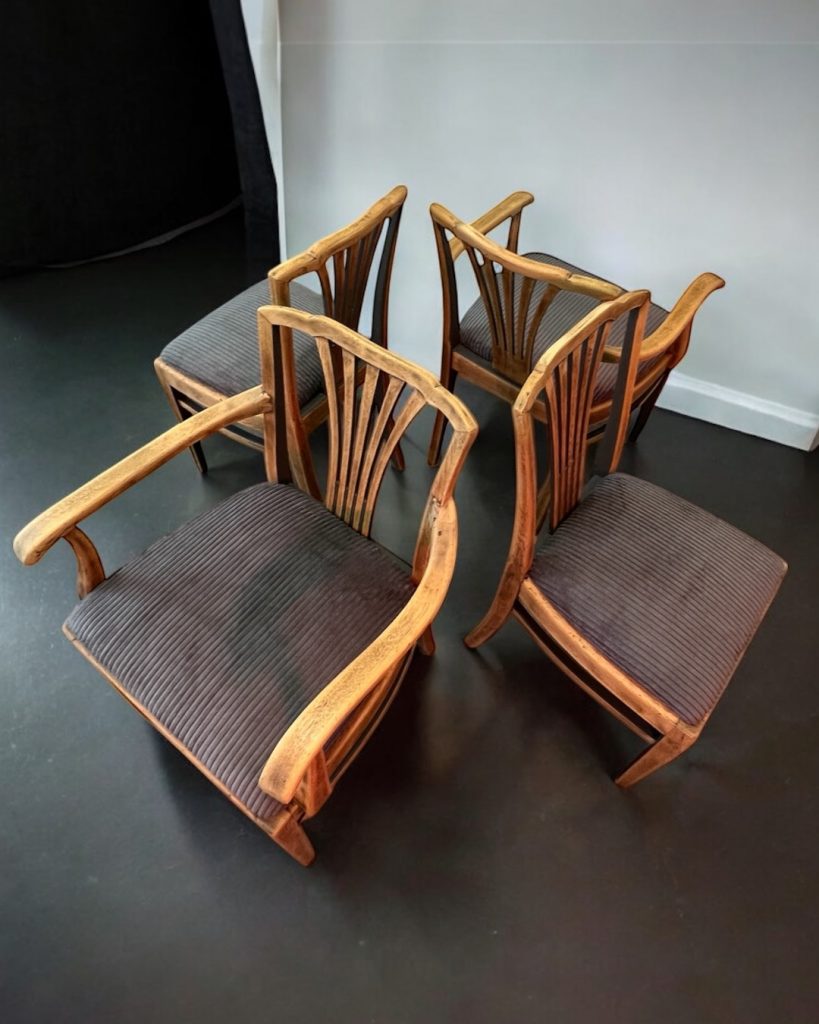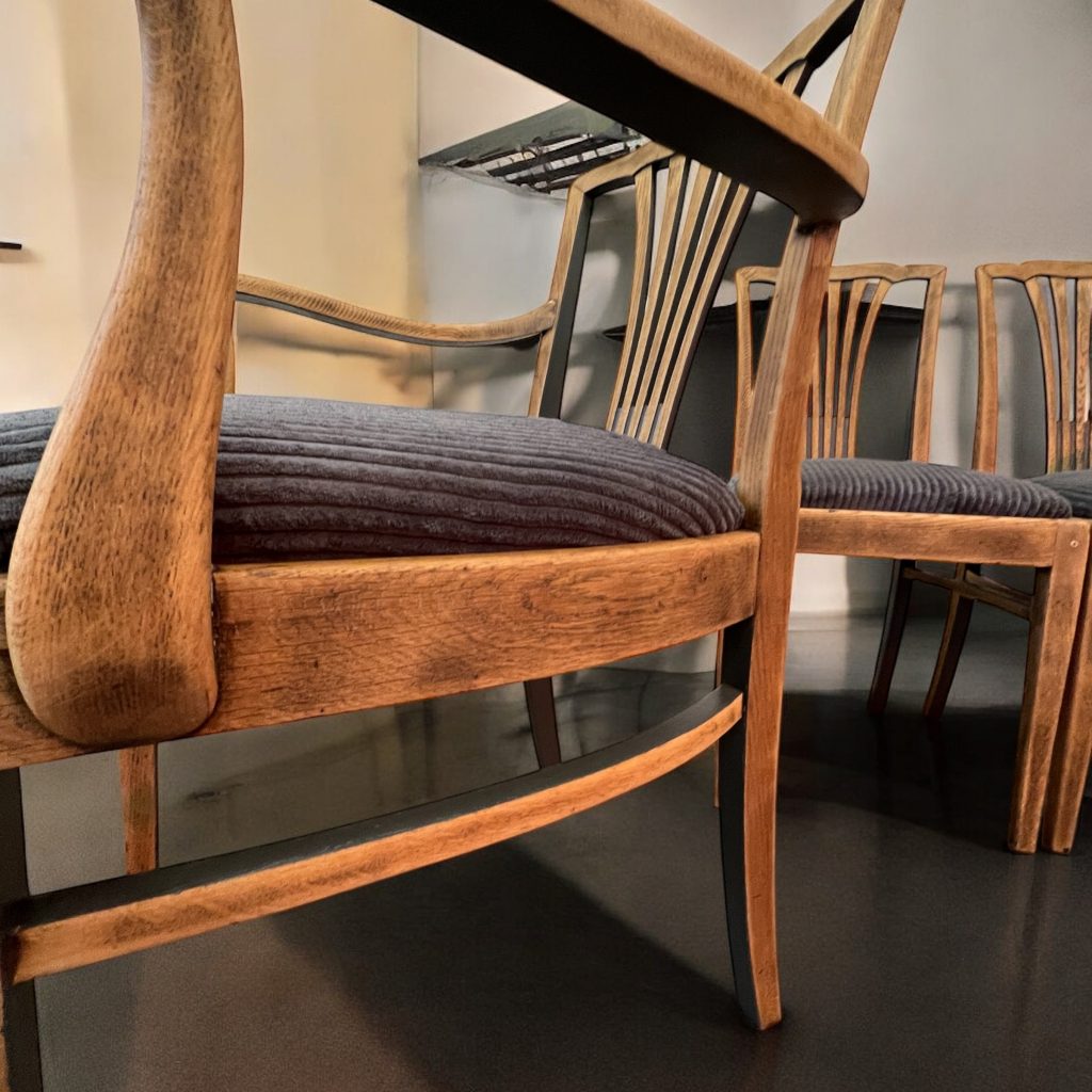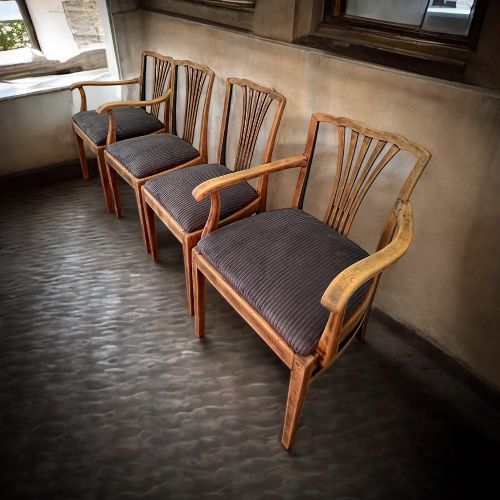 Vier restaurierte Stühle – „Die Sitz-Philosophen“ – Holz & Kordstoff, komplett aufgearbeitet