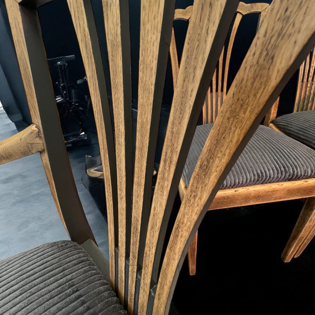 Ich biete ein Viererset klassischer Holzstühle an, vollständig aufgearbeitet und neu bezogen. Das Holz wurde abgeschliffen, die natürliche Maserung freigelegt und mit dezenten grauen Akzenten an den Beinen veredelt. Sitzflächen wurden mit hochwertigem grauen Kordstoff neu gepolstert.