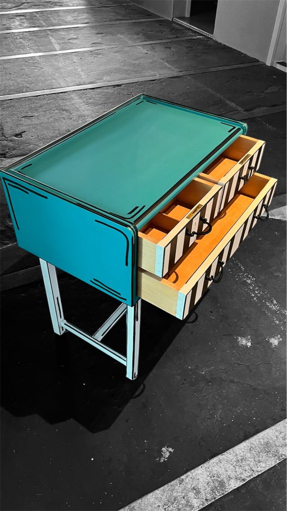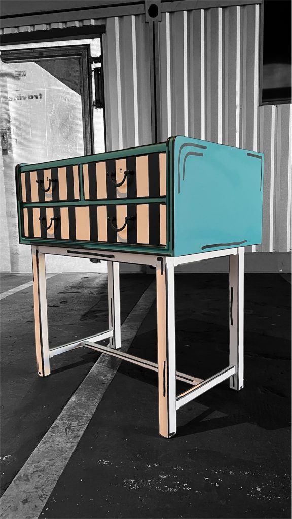 Comic Karl ist kein gewöhnliches Möbelstück – er ist ein Kunstwerk im 2D-Stil. Die klaren schwarzen Linien und das grafische Design lassen ihn wirken, als wäre er direkt einem Comicbuch entsprungen. Humor, Farbe und Charakter auf vier Beinen. Ob im Flur, im Wohnzimmer oder als Statement-Stück im Büro: Comic Karl sorgt garantiert für Gesprächsstoff.