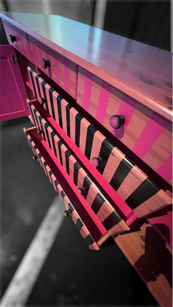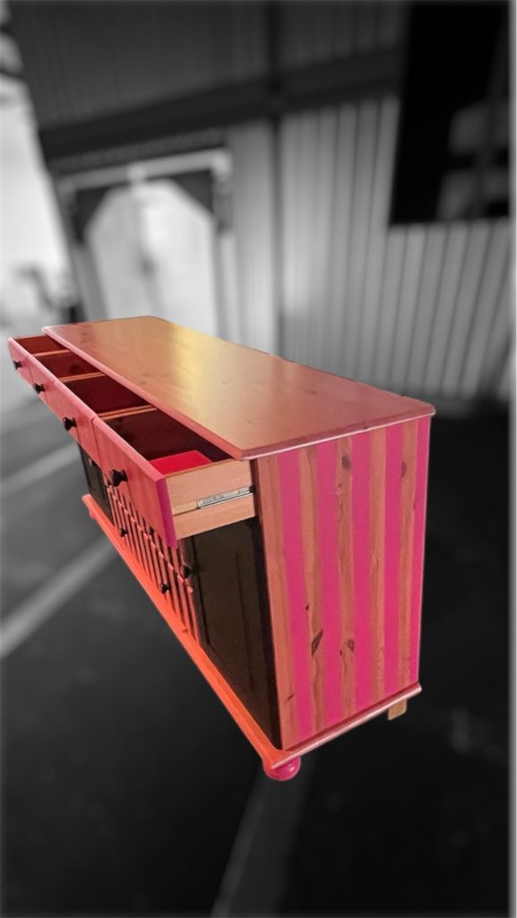 „Hildegard“ ist nichts für graue Ecken. Diese ausdrucksstarke Kommode wurde von mir vollständig upgecycelt und verwandelt mit ihrem außergewöhnlichen Design jeden Raum in etwas Besonderes. Die Kombination aus schwarz lackierten Flächen, handgemalten Streifen und kräftigem Pink macht sie zu einem echten Blickfang – charmant, eigenwillig und voller Leben.