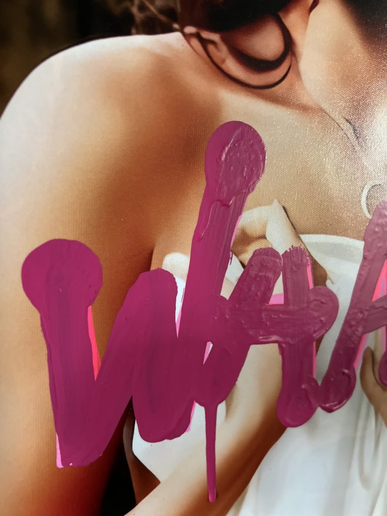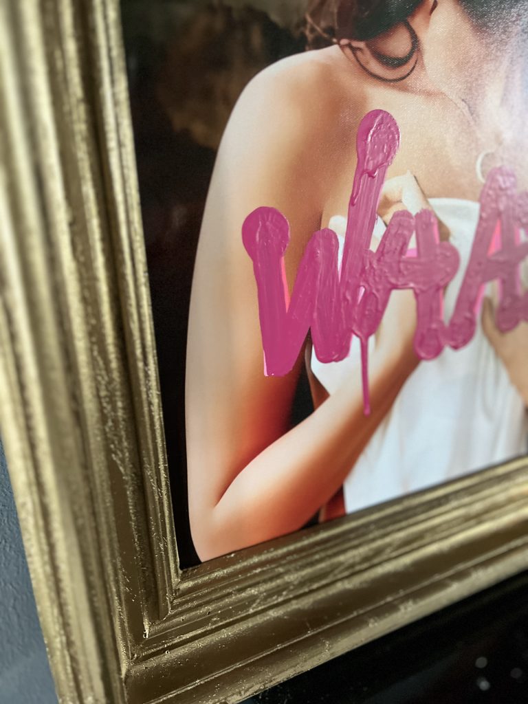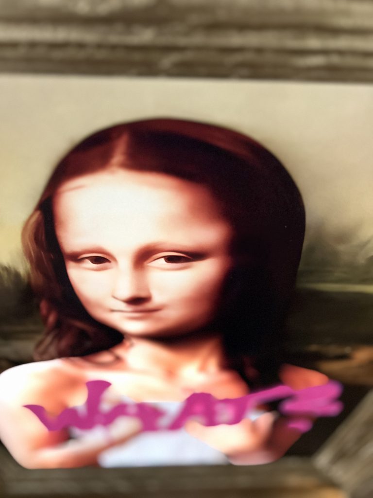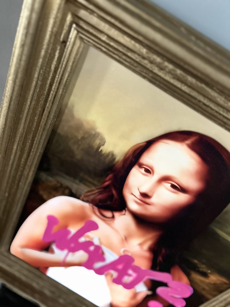 Ein Klassiker neu gedacht: Mona Mona wie man sie (noch) nie gesehen hat – nur von einem Handtuch bedeckt und mit einem frechen „WHAT?“ übermalt. Der goldene Rahmen hat schon einige Jahrzehnte gesehen und wurde mit diesem modernen Motiv zu neuem Leben erweckt.