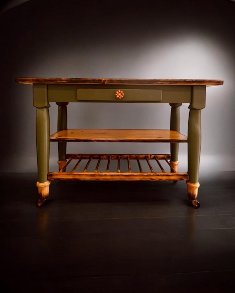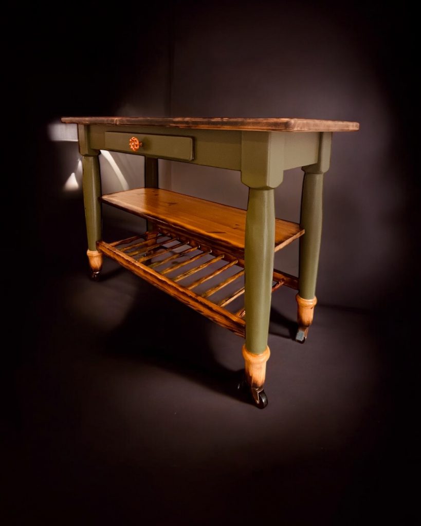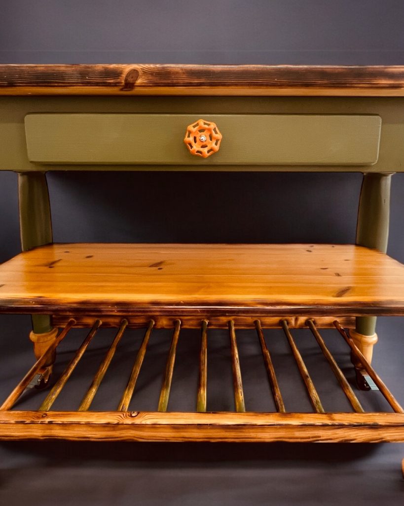 Das Möbel wurde vollständig überarbeitet, ergänzt und stabil erneuert. Dank der montierten Rollen ist es flexibel einsetzbar und leicht beweglich.
