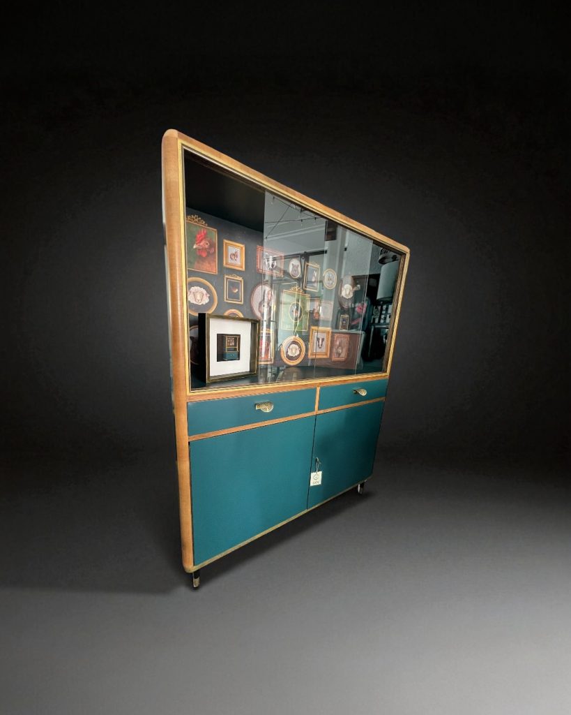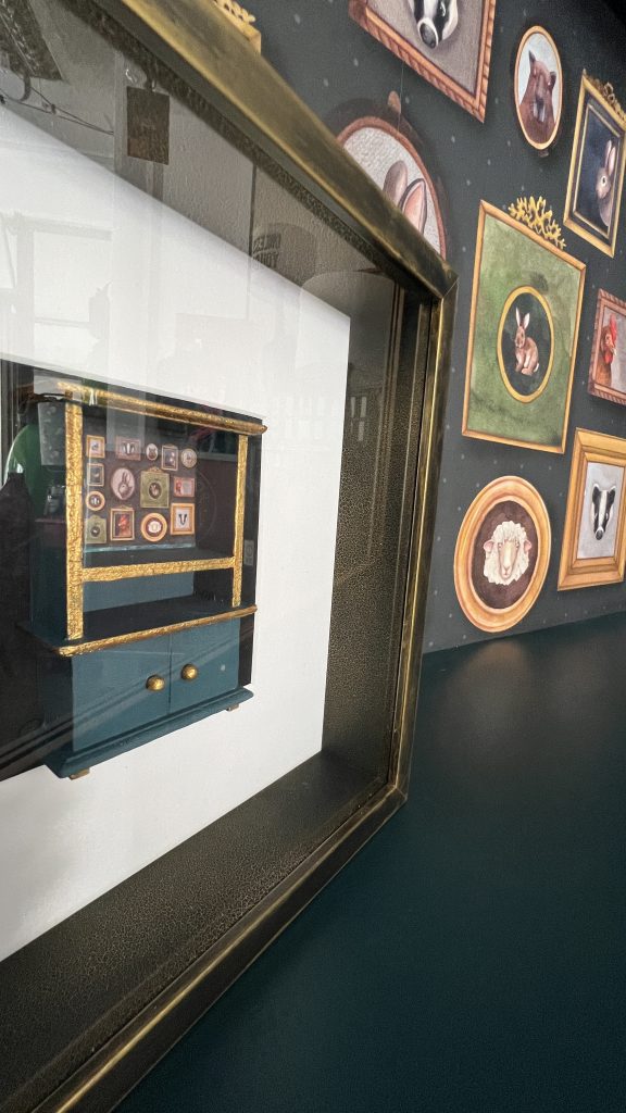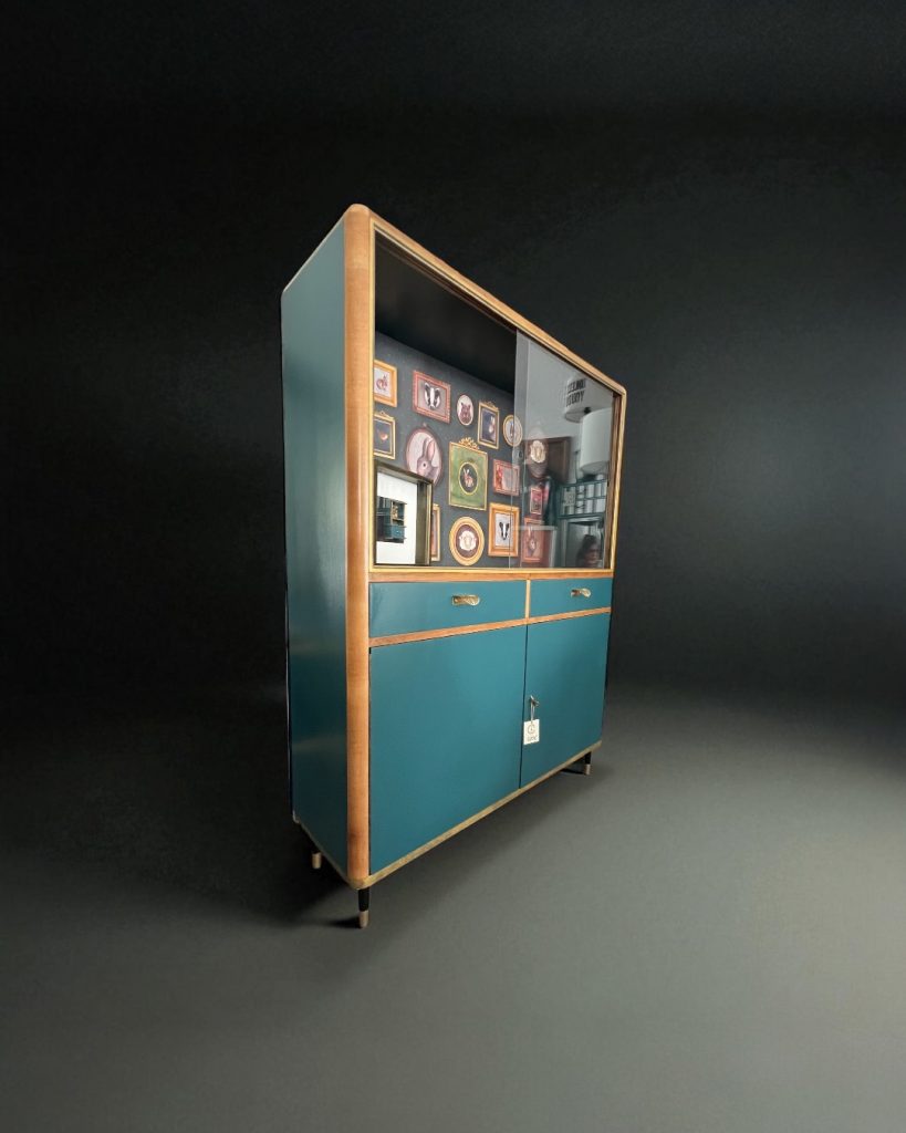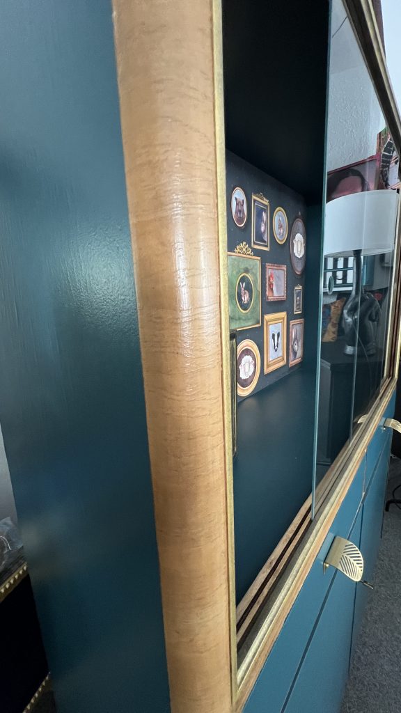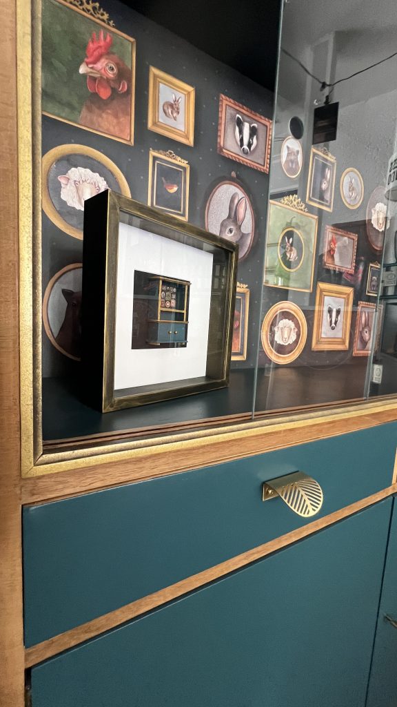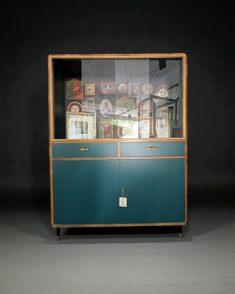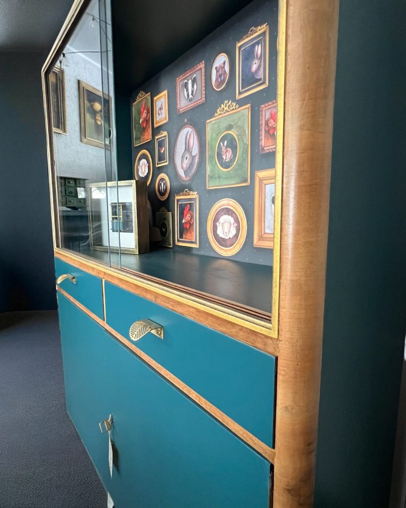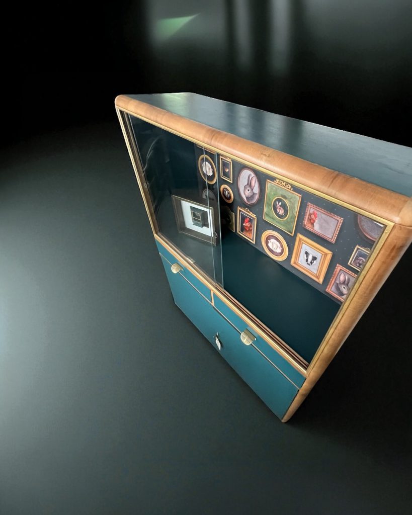 Die Vitrine erzählt in ihrer Gestaltung eine Geschichte: Der obere Teil ist mit liebevoll arrangierten Tierporträts verziert – jedes einzelne ein stiller Gruß an Angelikas Lebenswerk. Das Möbelstück selbst vereint satten Grünton mit goldenen Akzenten und einem warmen Holzton. Ein Blickfang mit Haltung.