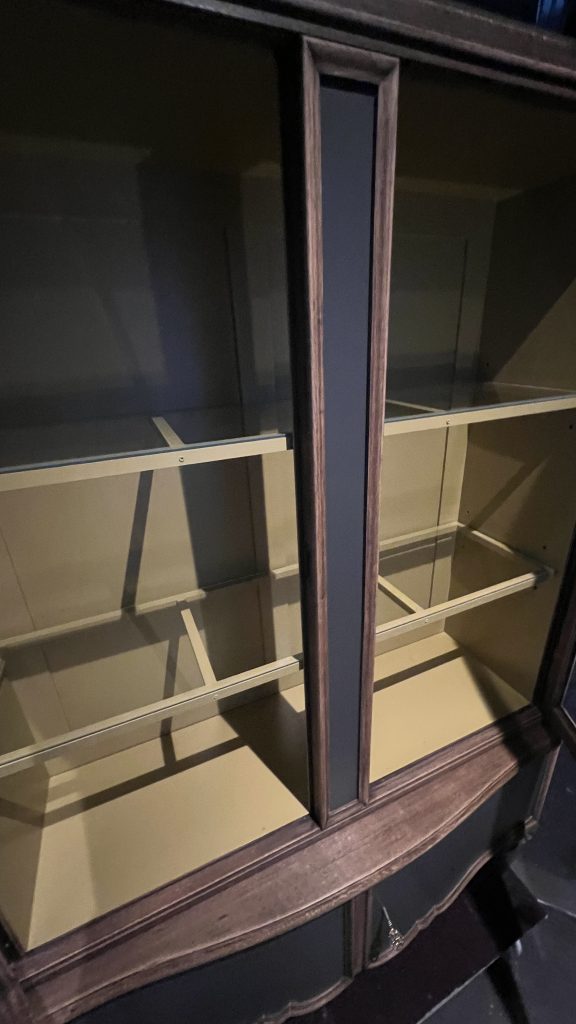 Das Holz wurde abgeschliffen und neu behandelt, die Innenflächen in einem warmen Curry Gelbton gestaltet. Die Vitrine bietet viel Stauraum und eignet sich ideal für Geschirr, Deko oder Sammlerstücke.