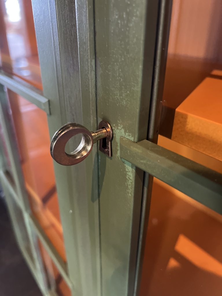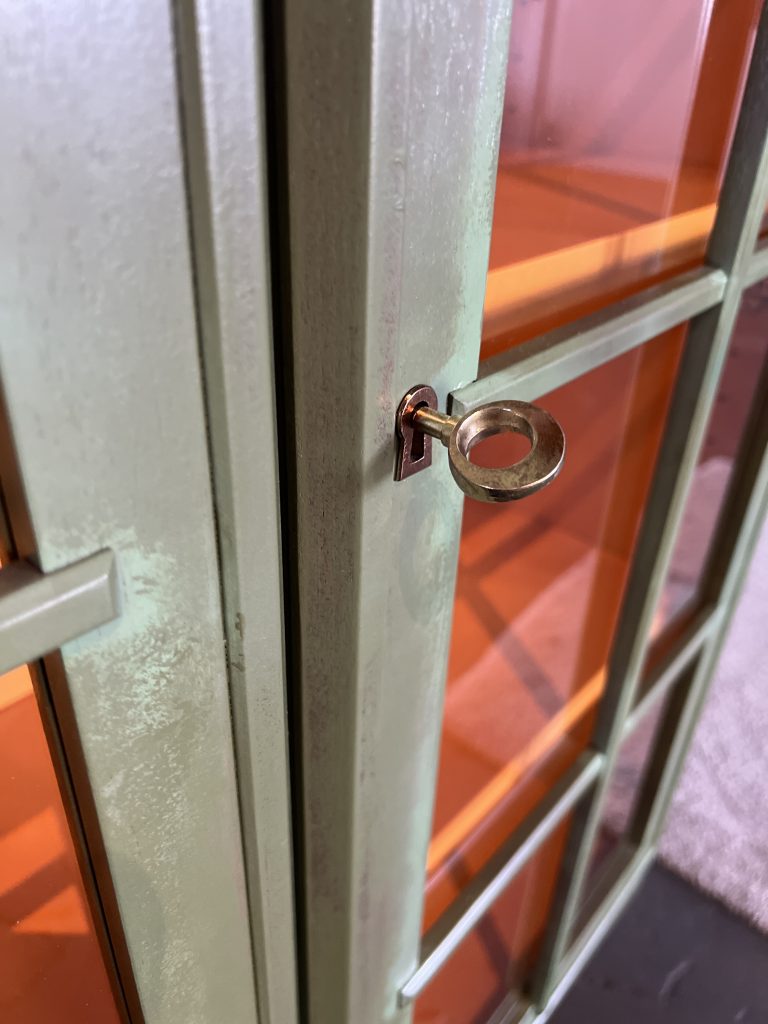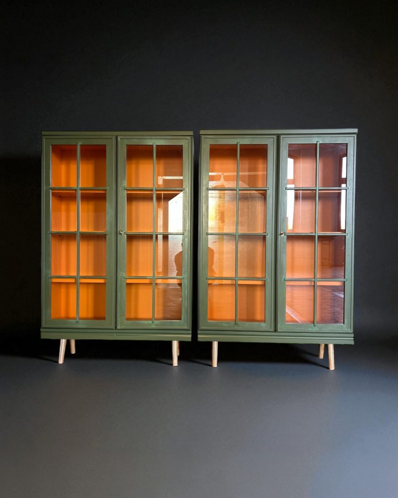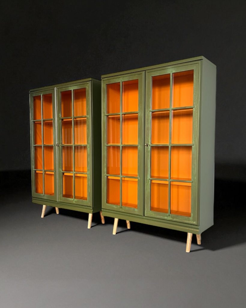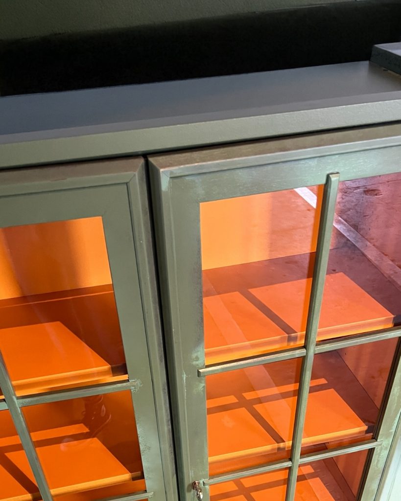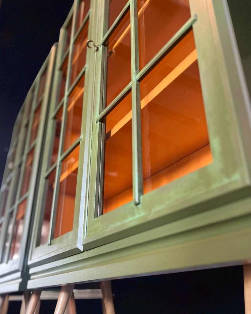 Die Vitrinen stammen ursprünglich aus einem großen Vitrinenschrank, wurden von mir liebevoll aufgearbeitet und neu gestaltet. Durch das besondere Upcycling haben sie einen einzigartigen Look bekommen: außen in einem metallisch-grünen Ton mit gewollt lebendiger Struktur, innen mit einer kräftigen orangefarbenen Rückwand.